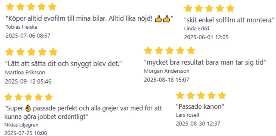 EVOFILM® är en helt unik högkvalitativ solfilm som alla kan montera utan förkunskaper. Filmen levereras färdigskuren för smidig och snabb montering. Dessutom erbjuder vi marknadens bästa garantier för ett tryggt köp!